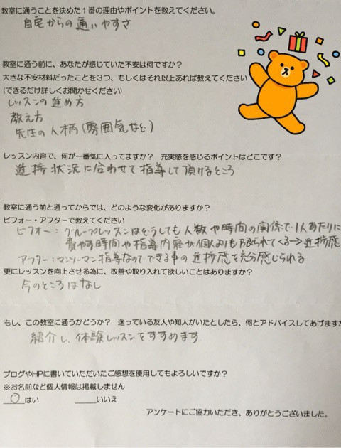 以前の教室ではグループレッスンということもあり、先生との距離があって、わからない事も聞けない感じだったので先生と楽しくお話しながら近い感じが嬉しいのだと思います。