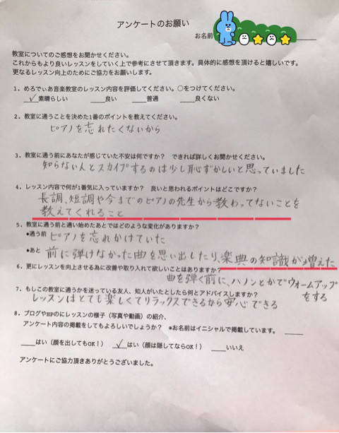 「楽典の勉強に関しては、後ろで見ている私も大変勉強になり、とても楽しかったです。本人も今日も「すごく楽しかった!」とレッスン直後に話していました。数あるスカイプ教室の中で、先生の楽しいブログに惹きつけられてご連絡を取らせていただきましたが、もっと早く先生にお願いしていればよかったとちょっと後悔しました。」